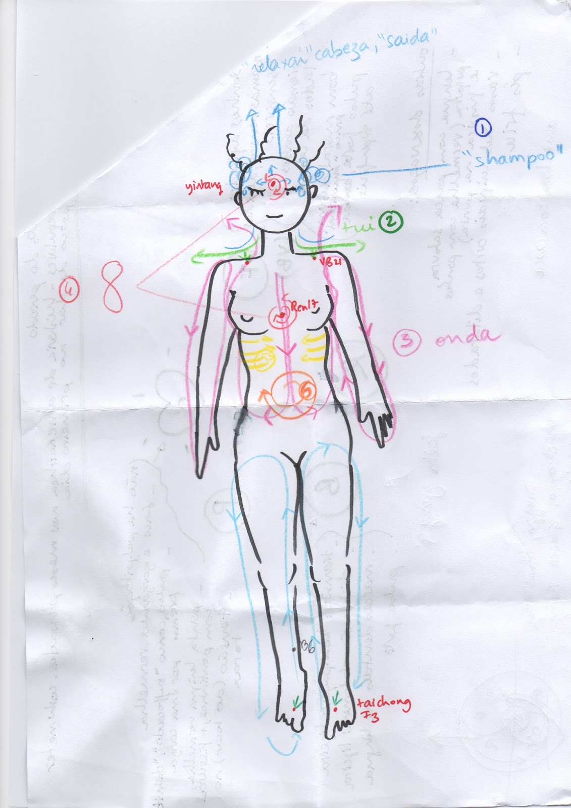 Ouvrez les zones qui se sont resserrées sur elles-mêmes (lombaires, abdomen, épigastre) en "poussant" (voire techniques chinoises ci dessous) à paumes pleines vers l'extérieur. Ouvrez des directions pour que l'énergie se (re)distribue vers les membres par exemple.